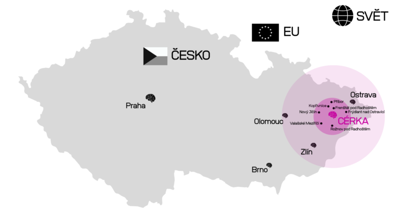 Projekt CÉRKA je pevně zakotven v jedinečné krajině Beskyd, v blízkosti klíčových moravských měst, jako jsou Ostrava, Olomouc a Zlín. Trojanovice jsou v bezprostředním sousedství města Frenštát pod Radhoštěm a v dojezdu do 20 minut se nacházejí města jako Nový Jičín, Kopřivnice, Rožnov pod Radhoštěm, Příbor, nebo Frýdlant nad Ostravicí. Tato strategická poloha v srdci střední Evropy je pro nás startovní čárou.